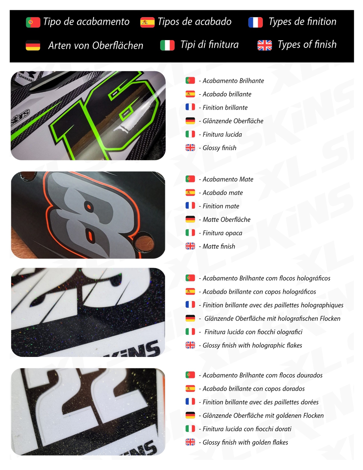 O Kit gráfico será personalizado de acordo com as instruções fornecidas nos campos apropriados, incluindo nome, número e logotipos/marcas.