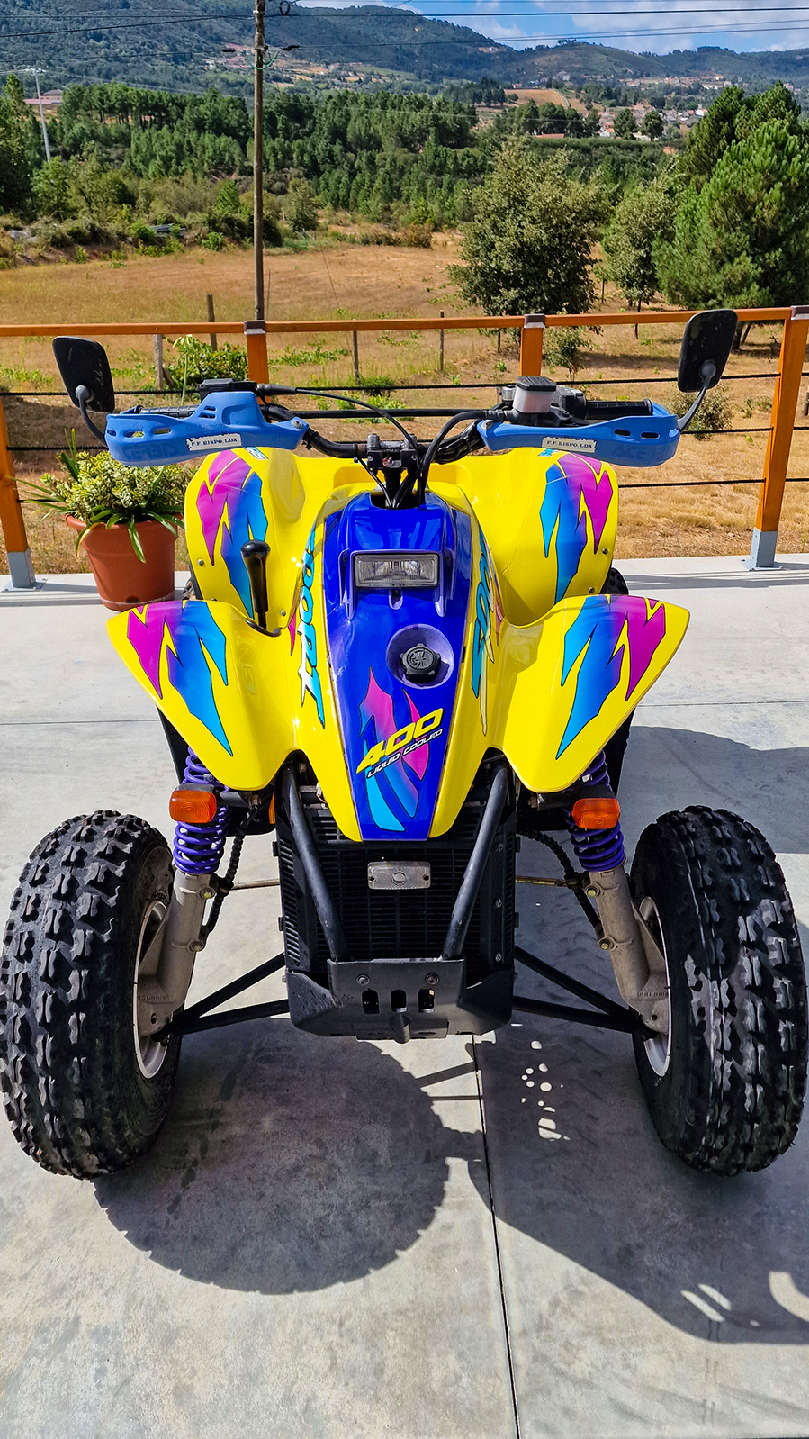 Quadriciclo amarelo colorido com texto 400 Liquid Cooled e Sport estacionado em calçada de cimento
