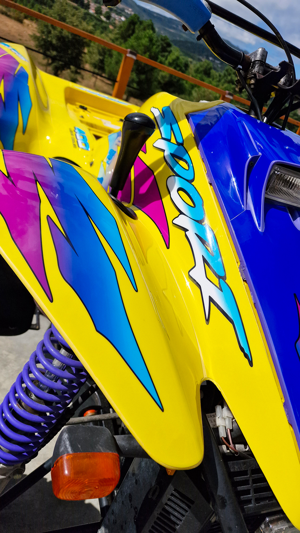Quad amarelo e azul com detalhes roxos e rosas em piso de cimento próximo a cerca de madeira