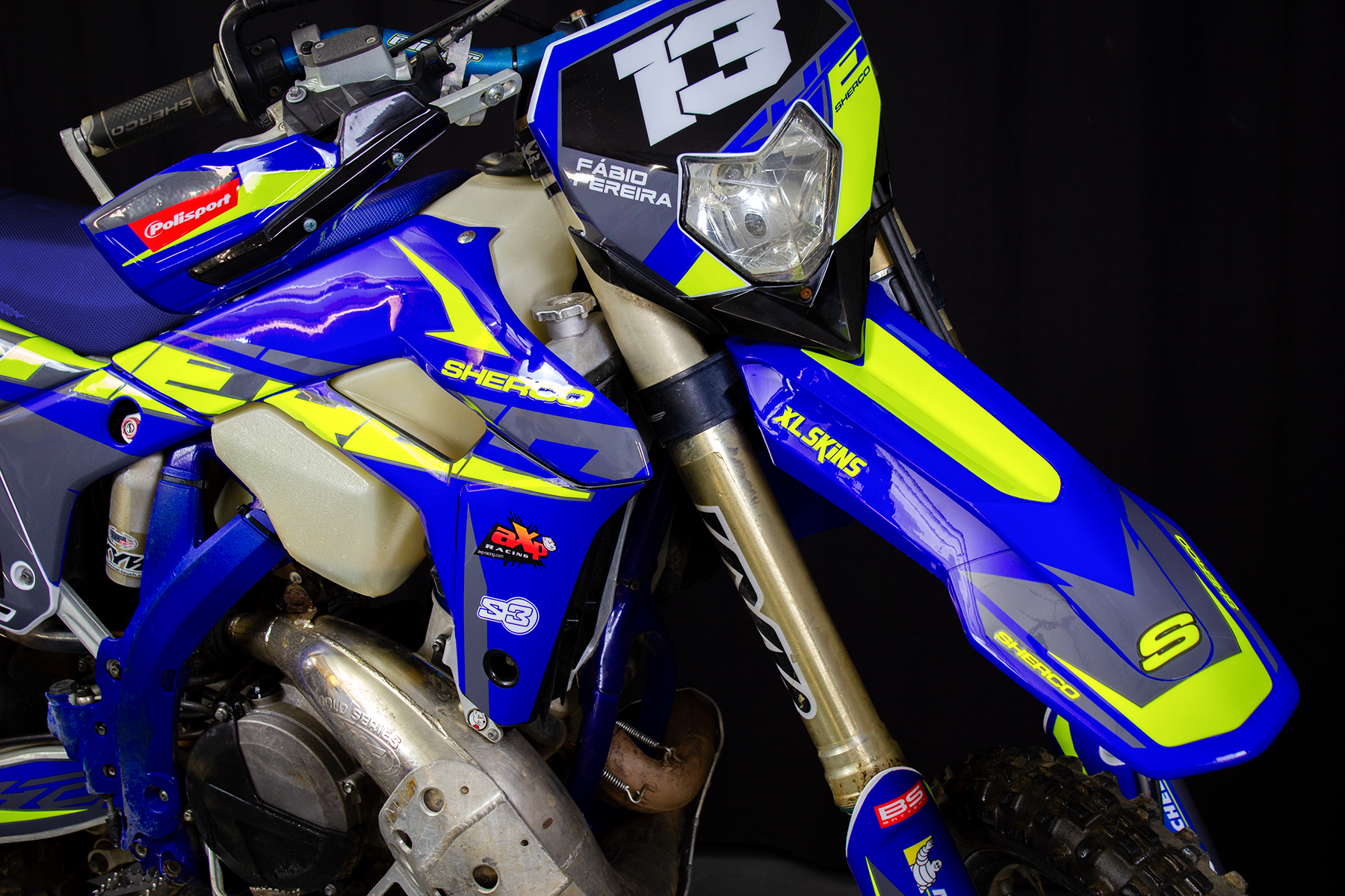 Motocross azul com detalhes amarelos, número 13 e textos SHERCO e FABIO FERREIRA